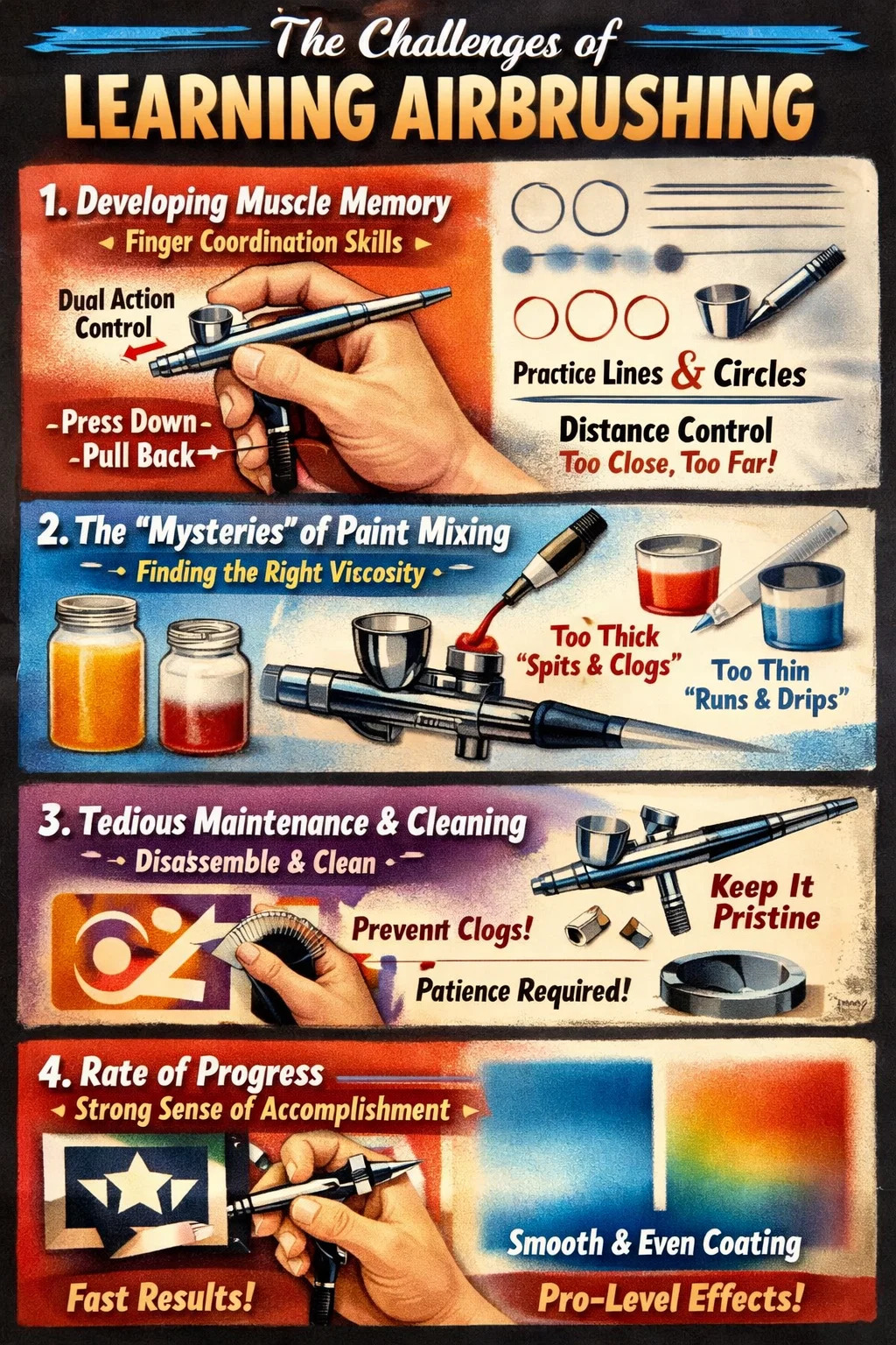 Berikut beberapa aspek praktis mengenai kesulitan belajar airbrushing: