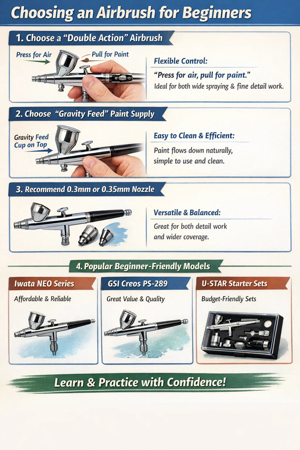 Untuk pemula yang baru memulai airbrushing , daya tahan, kemudahan pembersihan, dan kemudahan penggunaan adalah kriteria terpenting saat memilih alat pertama mereka. Anda tidak perlu mengincar model profesional yang paling mahal, tetapi Anda harus menghindari produk yang dibuat dengan harga murah untuk mencegah frustrasi.