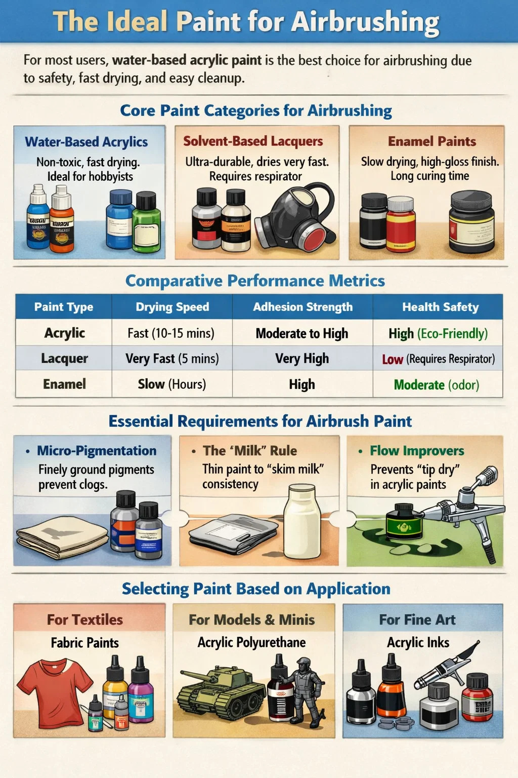 Bagi sebagian besar pengguna, cat akrilik berbahan dasar air adalah pilihan terbaik untuk airbrushing. Ini menawarkan keseimbangan optimal keamanan tidak beracun, waktu pengeringan cepat, dan pembersihan mudah dengan air biasa atau pembersih khusus. Meskipun penghobi tingkat lanjut mungkin menggunakan pernis untuk daya tahan yang ekstrim, akrilik adalah standar industri untuk ilustrasi umum, pemodelan skala, dan pekerjaan tekstil karena keserbagunaannya di berbagai permukaan dan bau kimia yang minimal.